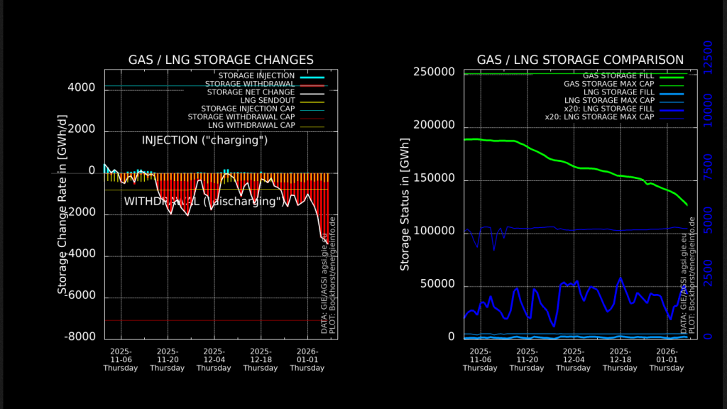Gasspeicher/LNG-Änderungsraten und Füllstände bis 7.1.2026: Das linke Diagramm zeigt die Änderungsraten der deutschen Gasspeicher. Positiv, hellblau ist Befüllung, Negativ, rot (gelb) die Entnahme aus den Speichern. gelb, dünn sind die LNG-Terminals dargestellt, deren FSRUs LNG-Speicher enthalten. Zudem sind die maximalen Befüll- und Entladeraten als Linien dargestellt, so dass man erkennen kann, ob z.B. die Entnahmerate weiter erhöht werden kann. Zum 7.1. wurde die maximale Entnahmerate zu ca. 50% ausgeschöpft. Das rechte Diagramm zeigt in grün die Füllmenge der Gasspeicher. In Hellblau sind die deutlch geringeren Füllmengen der LNG-Tanks der FSRUs der Terminals im gleichen Maßstab eingetragen. In mittlerem Blau sind die LNG-Füllmengen 20x vergrößert dargestellt, um deren Verlauf besser erkennen zu können. Die Variation der Füllstände ergibt sich aus der Tatsache, dass FSRUs in ca. 24 befüllt und die Füllmenge stark ansteigt. Danach wird das flüssige Erdgas in die Gasform überführt (verdampft) und über mehrere Tage in das Gasnetz eingespeist.„Gasspeicherstand in Deutschland bei 50%, Entladeraten hoch“ weiterlesen