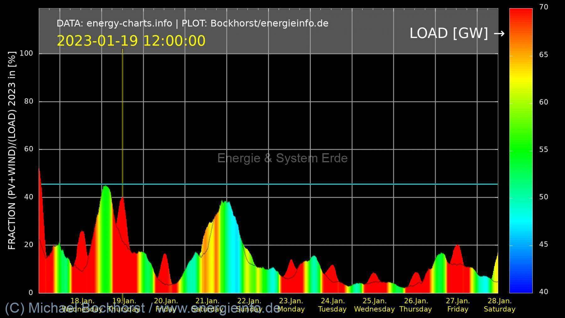 Die Bilder haben zur Orientierung einen Titel, der alle Informationen erhält. Dabei sind die ersten vier Bilder alle mit der gleichen Farbskala versehen, also von 0 … 100%, so dass die Kapazitätsfaktoren zwischen den einzelnen Kraftwerksarten vergleichbar sind: